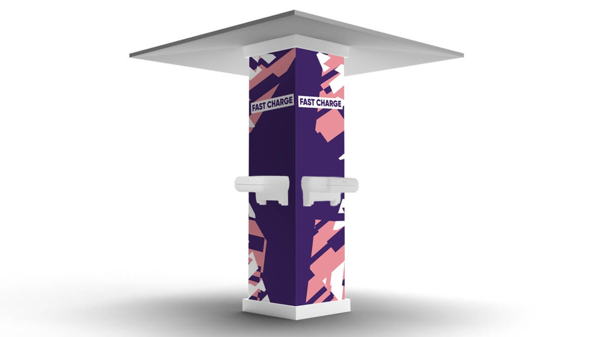 Crable’s Totems can charge up to 32 devices each, and with the British summer being predictably unpredictable, they also arranged protective canopies to shield festival goers from downpours. RG Live provided the branding pack, and Crable quickly designed striking visuals to wrap the Totems with eye-catching festival artwork.
